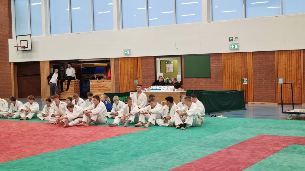 Dann kamen unsere U11-Kämpfer:innen auf die Matte, unglücklicherweise alle drei in einer Kampfgruppe und dazu Viktoria als einziges Mädchen unter vier Jungen. Aber sie konnte immerhin gegen ihren Vereinskameraden Adrian knapp gewinnen und kam so auf den zweiten Platz, Adrian wurde im Endergebnis Dritter seiner Klasse. Überragend war Mark, der alle seine vier Kämpfe souverän mit Siegen vor Ablauf der Kampfzeit gewann, darunter ein technisch toller Wurf gegen einen Orangegurt vom HSV Stöckte. Damit stand er verdient auf dem obersten Treppchen des Siegerpodestes.