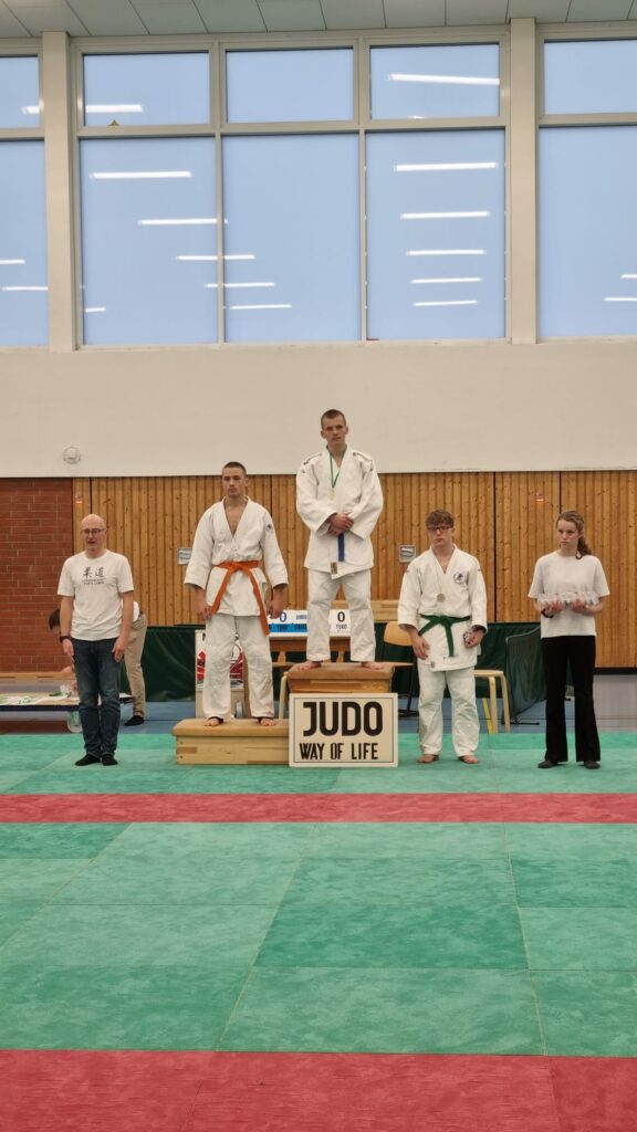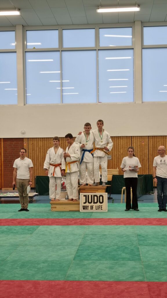 In der nächsten Altersklasse gab es erfreulicher Weise zweimal einen ersten Platz. Erfolgreich war Leon, der nach vielen Jahren Judo-Pause gleich wieder toll loslegte und gewann. Sein erster Kampf dauerte über neun Minuten, da keiner von beiden eine Wertung erzielen konnte. Erst dann gewann Leon mit einer kleinen Wertung. Ebenfalls auf den ersten Platz kam Youssef, der seine beiden Kämpfe mit Judowürgern gewann. David wurde Zweiter mit einem Sieg und einer Niederlage – schade, den hätte er auch gewinnen können. Aber für einen kleinen Fehler wird man leider im Judo bestraft.
