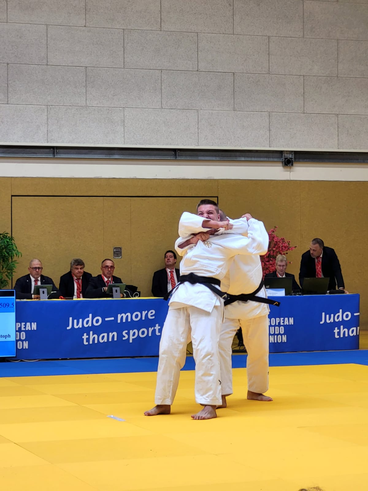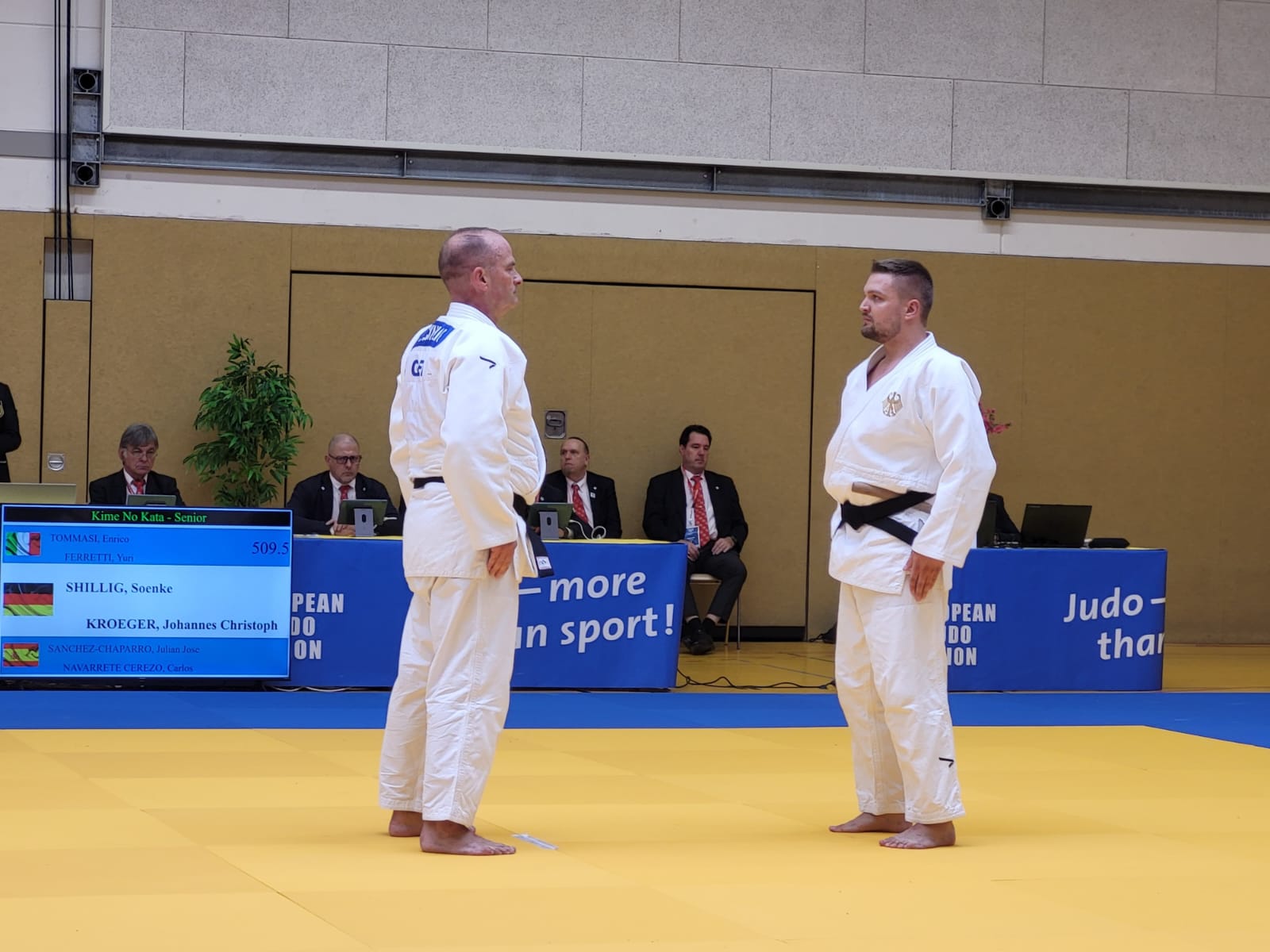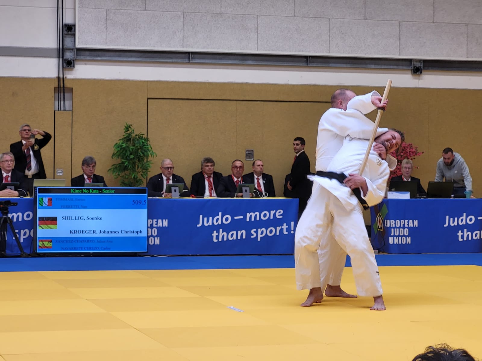Am Samstag fand das EJU Kata-Turnier statt. Hier trafen Sönke und Johannes auf starke Konkurrenz aus Italien, Spanien, den Niederlanden und Deutschland. Die Vorrunde begann mit einer technisch sicheren, jedoch im Ausdruck noch nicht so starken Demonstration. Hier fehlte den beiden noch die für die Kime no kata typische Explosivität. Mit 488 Punkten sicherten sie sich dennoch souverän den Einzug ins Finale der besten vier Paare.