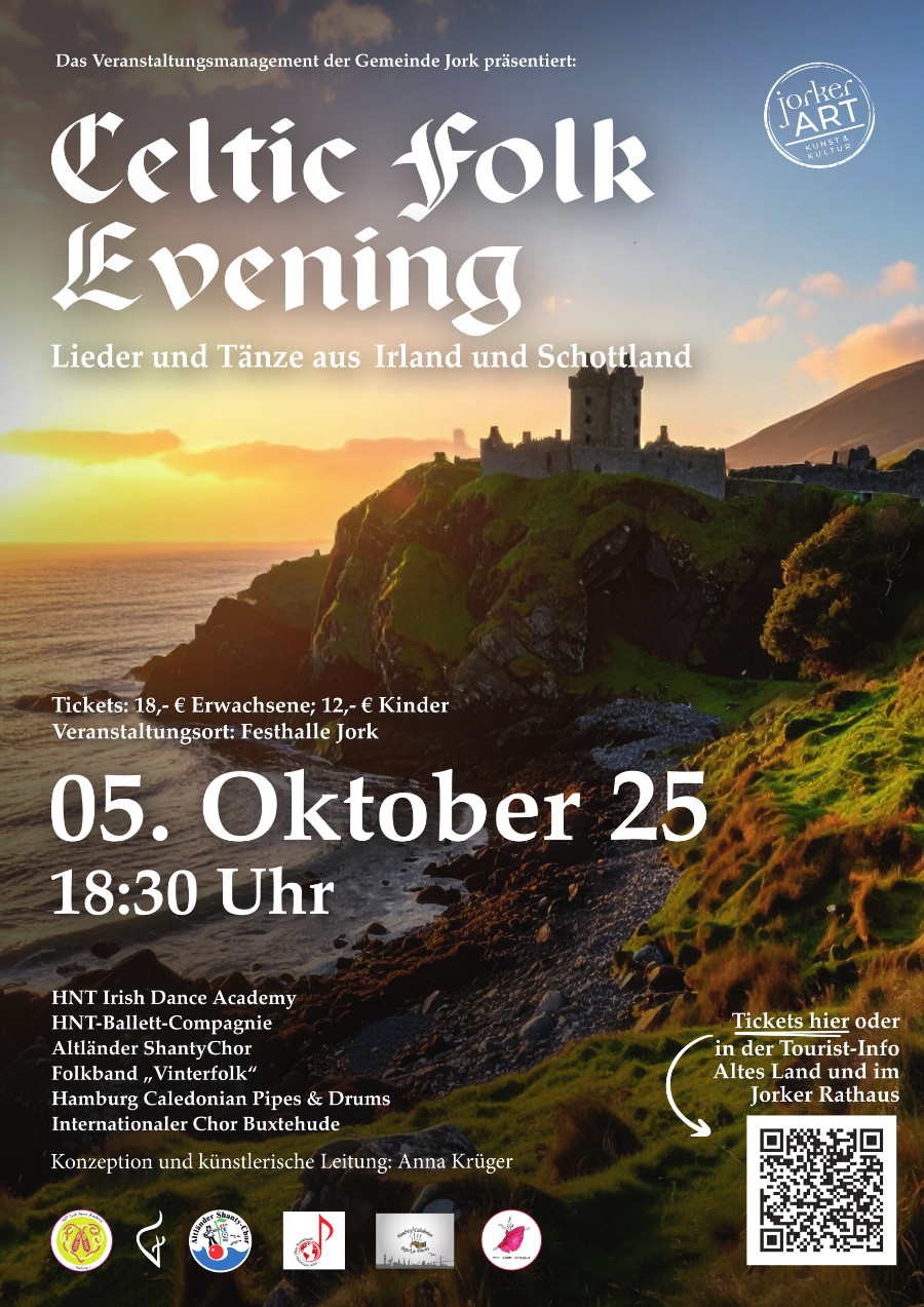 Beim Celtic Folk Evening am Sonntag, den 5. Oktober 2025 präsentieren unsere HNT Irish Dance Academy und die HNT-Ballett-Compagnie gemeinsam mit anderen Künstlern in der Festhalle Jork eine musikalische Reise voller Emotionen, Energie und Tradition.
